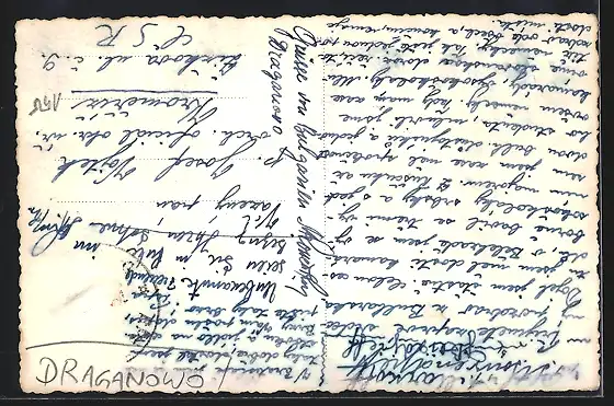 Personenbezogene Daten auf der Rückseite der Karte wurden durch blauen Textmarker unkenntlich gemacht. Die blauen Stellen sind auf die Vorderseite durchgeweicht und wirken sich negativ auf das Postkartenfoto aus
