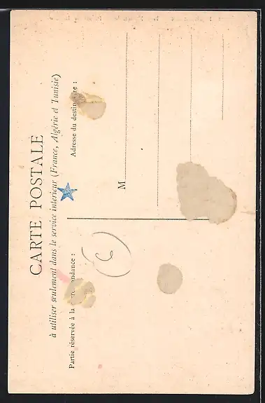 Personenbezogene Daten auf der Rückseite der Karte wurden durch blauen Textmarker unkenntlich gemacht. Die blauen Stellen sind auf die Vorderseite durchgeweicht und wirken sich negativ auf das Postkartenfoto aus