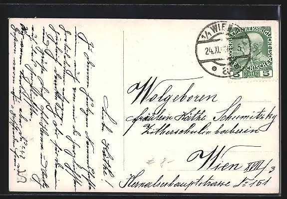 Personenbezogene Daten auf der Rückseite der Karte wurden durch blauen Textmarker unkenntlich gemacht. Die blauen Stellen sind auf die Vorderseite durchgeweicht und wirken sich negativ auf das Postkartenfoto aus