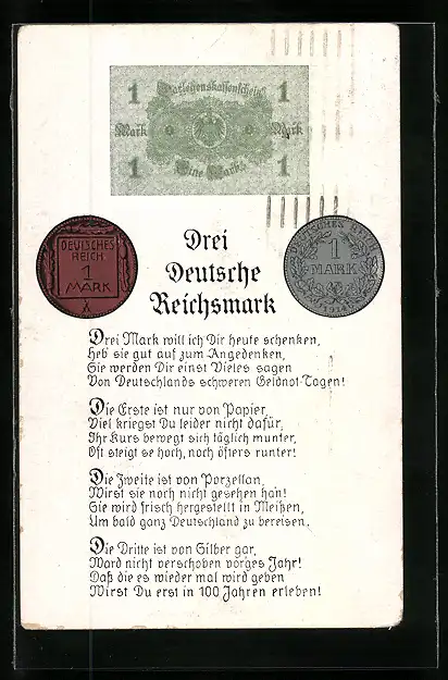 AK Drei Deutsche Reichsmark, Gedicht, Münzen und Geldschein