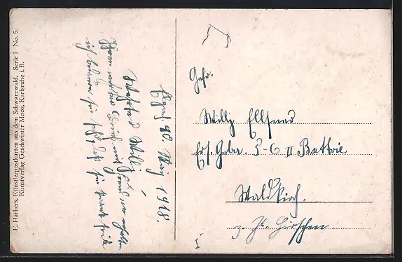 Personenbezogene Daten auf der Rückseite der Karte wurden durch blauen Textmarker unkenntlich gemacht. Die blauen Stellen sind auf die Vorderseite durchgeweicht und wirken sich negativ auf das Postkartenfoto aus