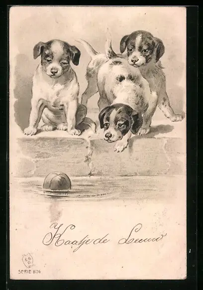 AK Drei Hundewelpen und ein ins Wasser gefallener Ball