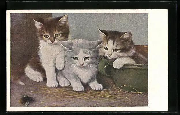 AK Drei Kätzchen beobachten eine Biene auf dem Stallboden