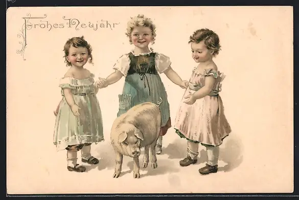 AK Drei Mädchen mit Glücksschwein, Prosit Neujahr