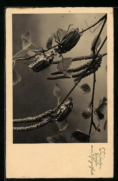 AK Drei Maikäfer an einer Birke, Pfingstgruss