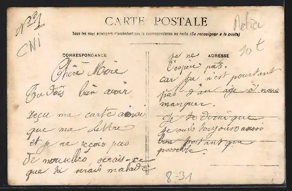 Personenbezogene Daten auf der Rückseite der Karte wurden durch blauen Textmarker unkenntlich gemacht. Die blauen Stellen sind auf die Vorderseite durchgeweicht und wirken sich negativ auf das Postkartenfoto aus