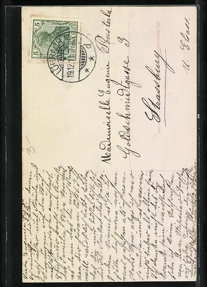 Personenbezogene Daten auf der Rückseite der Karte wurden durch blauen Textmarker unkenntlich gemacht. Die blauen Stellen sind auf die Vorderseite durchgeweicht und wirken sich negativ auf das Postkartenfoto aus