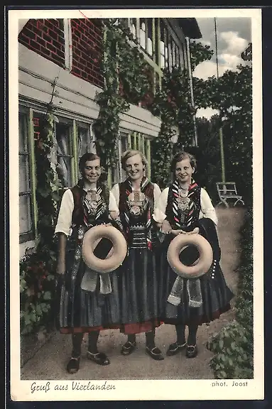 AK Drei junge Frauen in Vierländer Trachten vor dem Haus
