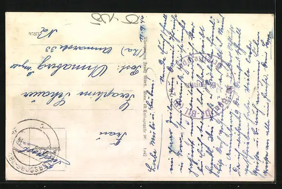 Personenbezogene Daten auf der Rückseite der Karte wurden durch blauen Textmarker unkenntlich gemacht. Die blauen Stellen sind auf die Vorderseite durchgeweicht und wirken sich negativ auf das Postkartenfoto aus