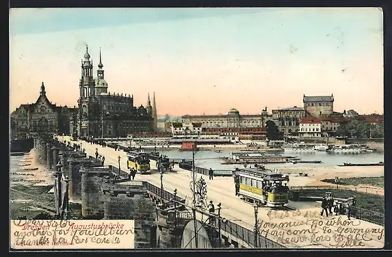 AK Dresden, Augustusbrücke mit Strassenbahnen