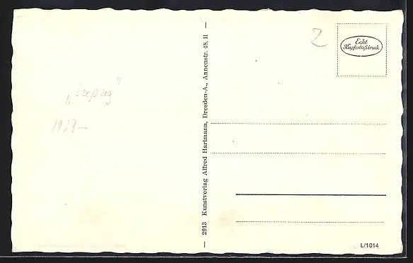 Personenbezogene Daten auf der Rückseite der Karte wurden durch blauen Textmarker unkenntlich gemacht. Die blauen Stellen sind auf die Vorderseite durchgeweicht und wirken sich negativ auf das Postkartenfoto aus