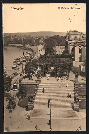 AK Dresden, Brühlsche Terrasse mit Strassenbahnen aus der Vogelschau