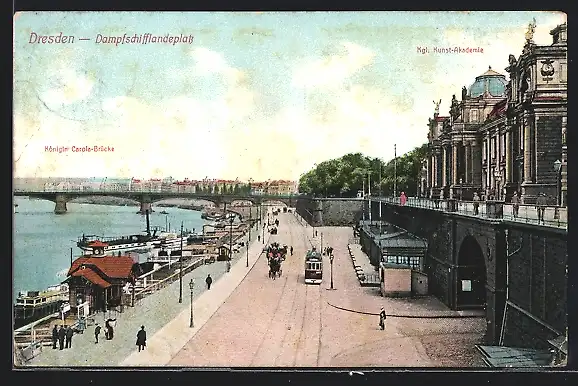 AK Dresden, Dampfschifflandeplatz mit Kgl. Kunst-Akademie und Strassenbahn