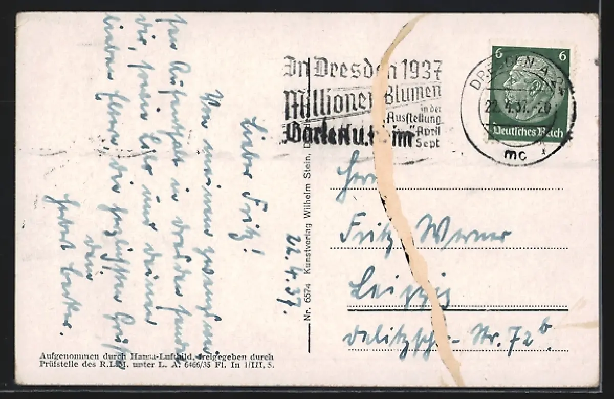 alte Ansichtskarte, gelaufen 1937, Eckknicke oben, rückseitig Oberflächenschaden, guter Zustand
