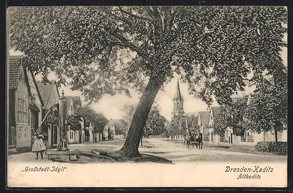AK Dresden-Kaditz, Strassenpartie mit Kirche in Altkaditz