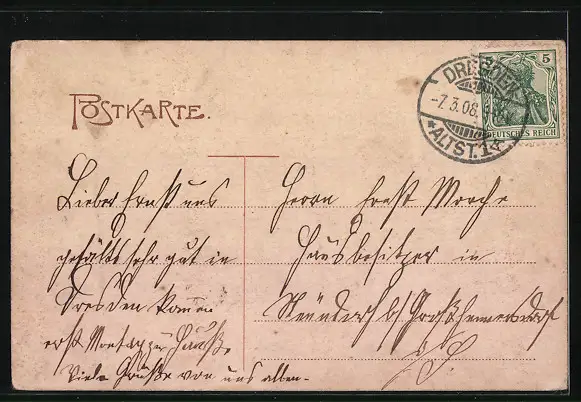 alte Ansichtskarte, gelaufen 1908, Stempelspur, guter Zustand