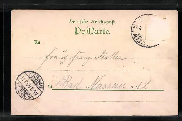 alte Ansichtskarte, gelaufen 1900, Briefmarke entfernt, rückseitig Oberflächenschaden, Eckknick unten re., guter Zustand