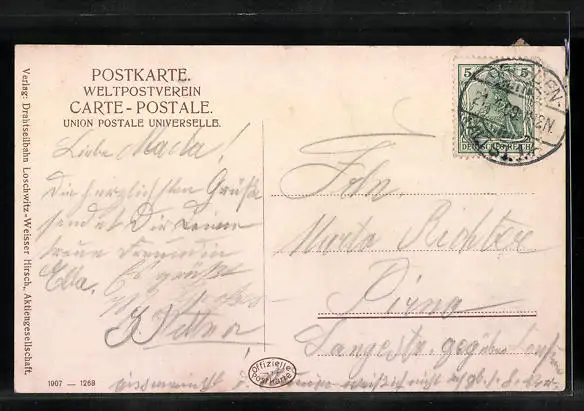 alte Ansichtskarte, gelaufen 1909, Papierrest Ecke li. oben, sonst guter Zustand