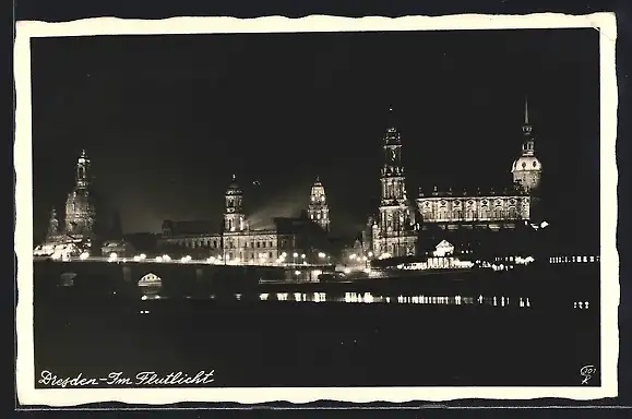 AK Dresden, Nächtliche Stadt im Flutlicht