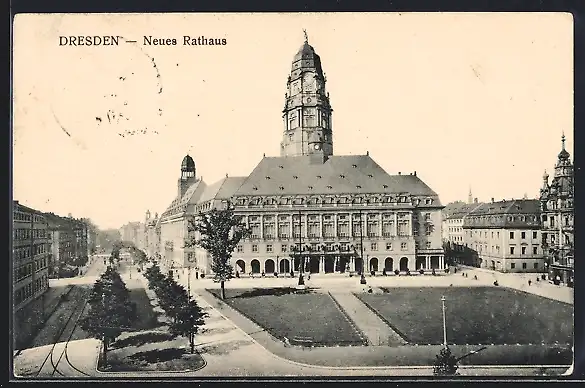 AK Dresden, Neues Rathaus mit Strassenpartie
