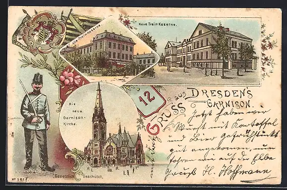 AK Dresden-Neustadt, Garnison, Alte und neue Train-Kaserne, Garnisonkirche und Soldat des 12. Regiments