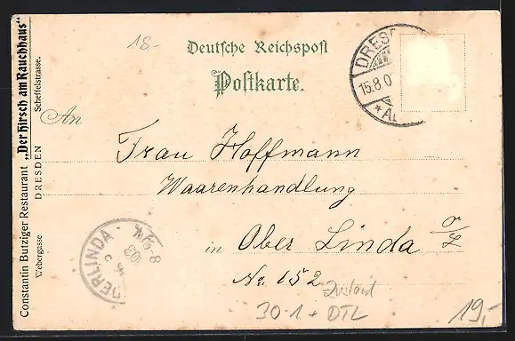 Personenbezogene Daten auf der Rückseite der Karte wurden durch blauen Textmarker unkenntlich gemacht. Die blauen Stellen sind auf die Vorderseite durchgeweicht und wirken sich negativ auf das Postkartenfoto aus