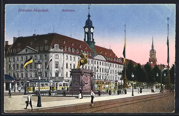 AK Dresden-Neustadt, Partie am Rathaus mit Denkmal & Strassenbahn