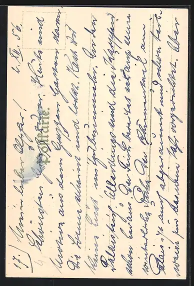 Personenbezogene Daten auf der Rückseite der Karte wurden durch blauen Textmarker unkenntlich gemacht. Die blauen Stellen sind auf die Vorderseite durchgeweicht und wirken sich negativ auf das Postkartenfoto aus