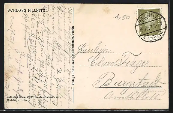 Personenbezogene Daten auf der Rückseite der Karte wurden durch blauen Textmarker unkenntlich gemacht. Die blauen Stellen sind auf die Vorderseite durchgeweicht und wirken sich negativ auf das Postkartenfoto aus