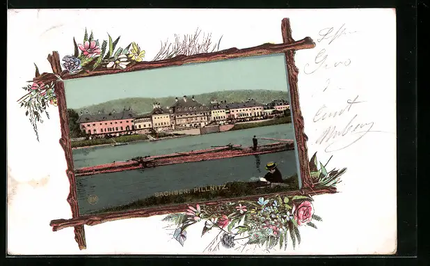 AK Dresden-Pillnitz, Uferpartie mit Fähre, Passepartout