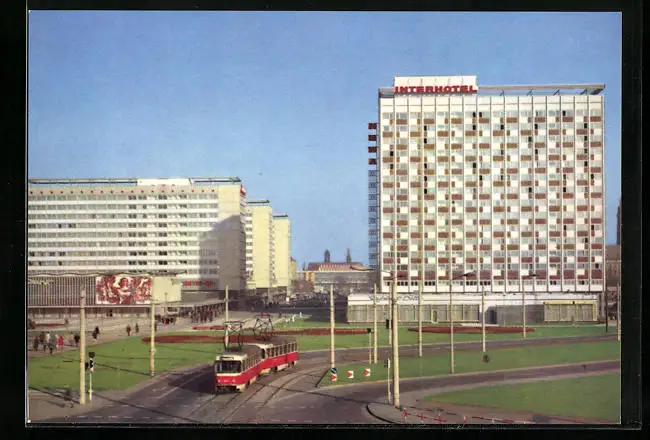 AK Dresden, Prager Strasse mit Interhotel Newa, Strassenbahn