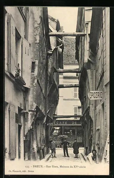 AK Dreux, Rue Iliers, Maisons du XVe siècle, Strassenpartie
