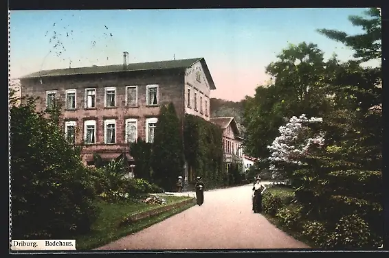 AK Driburg, Wegpartie vor dem Badehaus mit Passanten