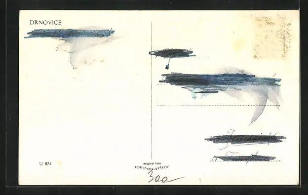 Personenbezogene Daten auf der Rückseite der Karte wurden durch blauen Textmarker unkenntlich gemacht. Die blauen Stellen sind auf die Vorderseite durchgeweicht und wirken sich negativ auf das Postkartenfoto aus