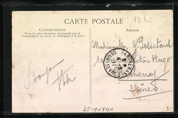 Personenbezogene Daten auf der Rückseite der Karte wurden durch blauen Textmarker unkenntlich gemacht. Die blauen Stellen sind auf die Vorderseite durchgeweicht und wirken sich negativ auf das Postkartenfoto aus