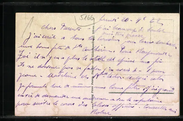 Personenbezogene Daten auf der Rückseite der Karte wurden durch blauen Textmarker unkenntlich gemacht. Die blauen Stellen sind auf die Vorderseite durchgeweicht und wirken sich negativ auf das Postkartenfoto aus