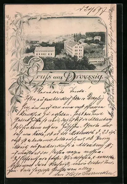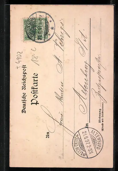 alte Ansichtskarte, gelaufen 1897, Bugspur oben links und unten rechts, guter Zustand