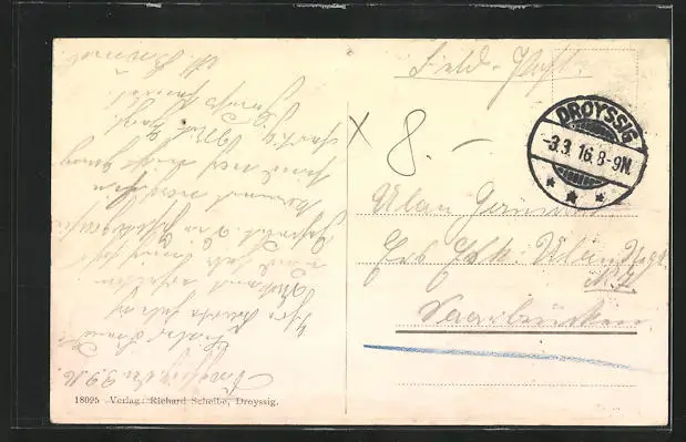 alte Ansichtskarte, gelaufen 1916, Stempelspur, Stecknadellöcher oben, Abriebspur re. oben, guter Zustand