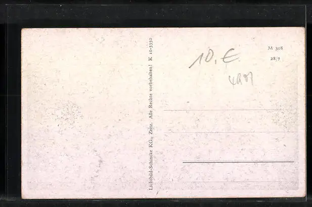 Personenbezogene Daten auf der Rückseite der Karte wurden durch blauen Textmarker unkenntlich gemacht. Die blauen Stellen sind auf die Vorderseite durchgeweicht und wirken sich negativ auf das Postkartenfoto aus