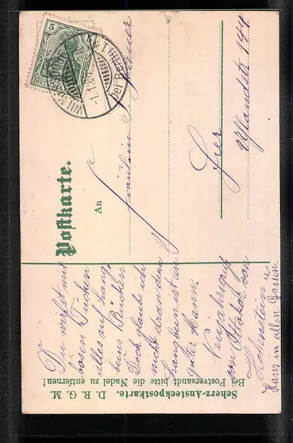 alte Ansichtskarte, gelaufen 1908, Eckknicke re. oben, Einriss oben mittig, Stecknadelloch re. mittig, guter Zustand