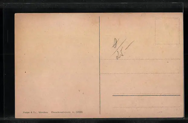 Personenbezogene Daten auf der Rückseite der Karte wurden durch blauen Textmarker unkenntlich gemacht. Die blauen Stellen sind auf die Vorderseite durchgeweicht und wirken sich negativ auf das Postkartenfoto aus