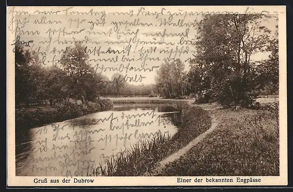 AK Dubrow, Uferpartie mit Bäumen