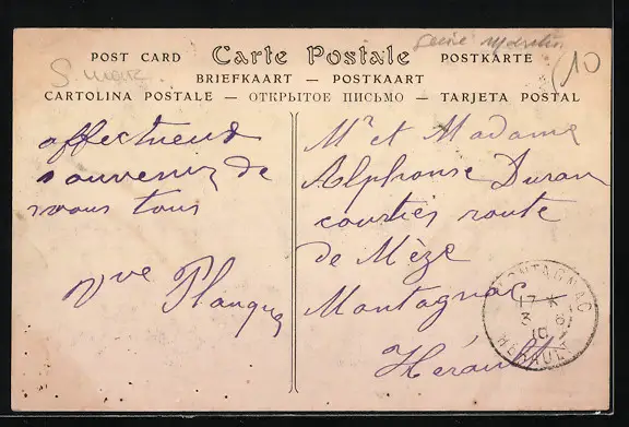 Personenbezogene Daten auf der Rückseite der Karte wurden durch blauen Textmarker unkenntlich gemacht. Die blauen Stellen sind auf die Vorderseite durchgeweicht und wirken sich negativ auf das Postkartenfoto aus
