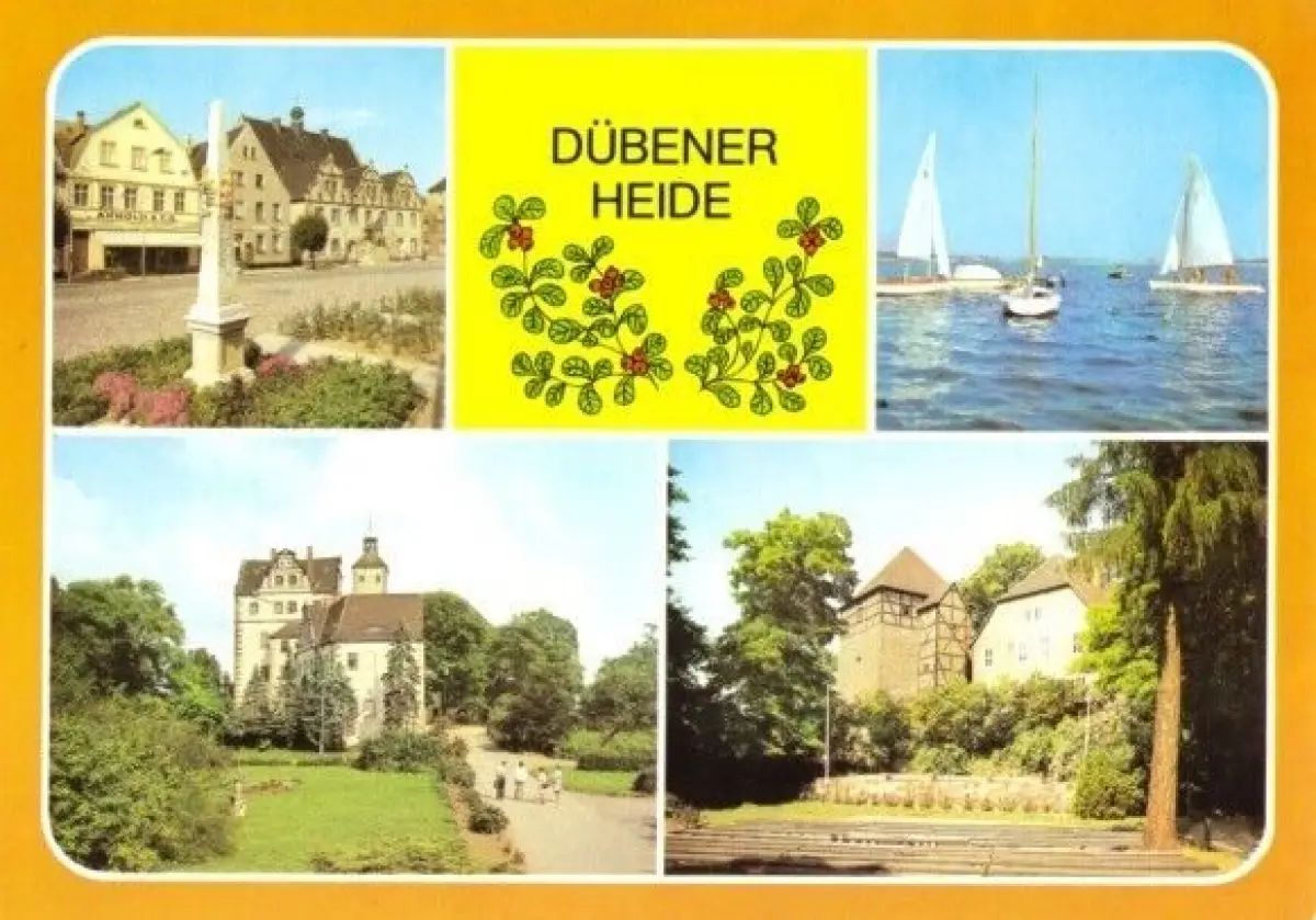 Ansichtskarte Dübener Heide vier Abb. - Kemberg - Platz des Friedens, Bergwitzsee, Pretzsch - ehem. Schloß, Bad Düben - Burg und Freilichtbühne Erhaltung I-II postalisch gelaufen, gestempelt: Bad Schmiedeberg, 1.12.88 Druckvermerk: 1986 Herstellungsland: DDR Verlag: Bild und Heimat Reichenbach - 01 08 0381/40