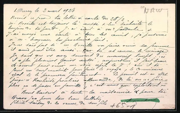 Personenbezogene Daten auf der Rückseite der Karte wurden durch blauen Textmarker unkenntlich gemacht. Die blauen Stellen sind auf die Vorderseite durchgeweicht und wirken sich negativ auf das Postkartenfoto aus