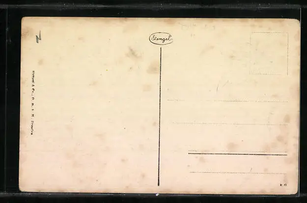 Personenbezogene Daten auf der Rückseite der Karte wurden durch blauen Textmarker unkenntlich gemacht. Die blauen Stellen sind auf die Vorderseite durchgeweicht und wirken sich negativ auf das Postkartenfoto aus