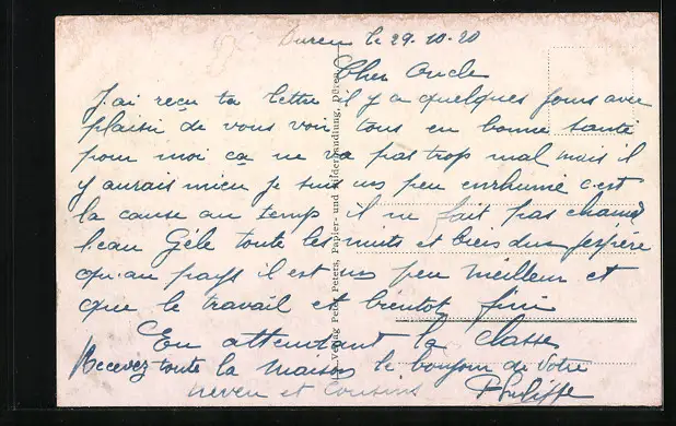 Personenbezogene Daten auf der Rückseite der Karte wurden durch blauen Textmarker unkenntlich gemacht. Die blauen Stellen sind auf die Vorderseite durchgeweicht und wirken sich negativ auf das Postkartenfoto aus