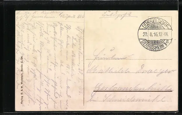 Personenbezogene Daten auf der Rückseite der Karte wurden durch blauen Textmarker unkenntlich gemacht. Die blauen Stellen sind auf die Vorderseite durchgeweicht und wirken sich negativ auf das Postkartenfoto aus