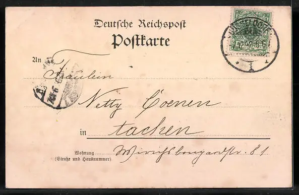 Personenbezogene Daten auf der Rückseite der Karte wurden durch blauen Textmarker unkenntlich gemacht. Die blauen Stellen sind auf die Vorderseite durchgeweicht und wirken sich negativ auf das Postkartenfoto aus