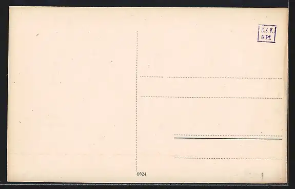 Personenbezogene Daten auf der Rückseite der Karte wurden durch blauen Textmarker unkenntlich gemacht. Die blauen Stellen sind auf die Vorderseite durchgeweicht und wirken sich negativ auf das Postkartenfoto aus